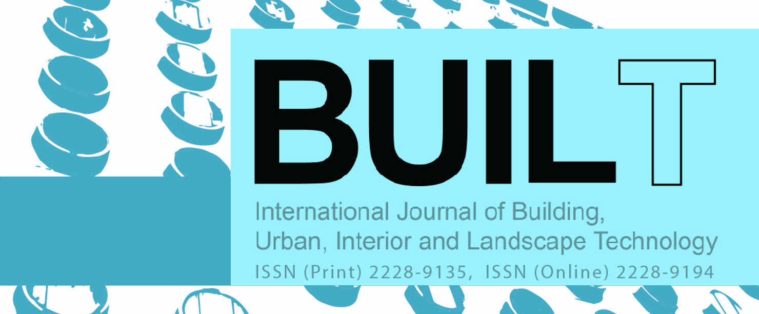International Journal of Building, Urban, Interior and Landscape Technology (BUILT) is a peer-reviewed journal that focuses on original research in architectural and technological applications on an international level. The journal welcomes contributors in the field of "Building", "Urban" "Interior" and "Landscape" environments to showcase the cutting-edge "Technology" in architectural research. The structure and direction of this journal cater to the needs of both academic and professional audiences. Each article will be divided into two main parts including "Theory" and "Applications". The former focuses on theoretical research of authors' expertise, while the latter allows authors to discuss the architectural applications utilized his/her 'practice-oriented' research.This journal aims to benefit the wider community by providing tailored scientific journal papers. Professionals and researchers are invited to contribute their ideas and expertise, cultivating a collaborative environment for sharing insights among peers. Moreover, it functions as an educational platform, offering audiences exposure to innovative ideas and knowledge.